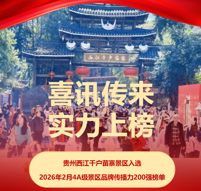 | 近日,迈点研究院独家发布榜单,西江千户苗寨凭借强劲的品牌影响力、优质的文旅体验与持续攀升的市场热度,成功入选 “2026 年 2 月 4A 级景区品牌传播力 200 强榜单”,并一举斩获4A 级景区类型细分榜单・乡村田园类 TOP1、4A 级景区区域细分榜单・西南地区 TOP7两项重磅荣誉,独具特色的人文景观、扎实的品牌实力与口碑积淀,为贵州乡村文旅再添亮眼注脚! 本次榜单由权威机构发布,综合搜索指数、媒体指数、运营指数、点评指数4个维度分析品牌在互联网和移动互联网的传播力,全面反映景区在全国文旅市场的传播力、美誉度与综合竞争力。西江千户苗寨在全国众多 4A 级景区中脱颖而出,既是对景区长期坚持文旅融合、品质提升、品牌塑造的高度认可,也是对黔东南苗族文化魅力与乡村旅游发展成果的有力见证。 作为世界最大苗族聚居村寨、国家 AAAA 级旅游景区,西江千户苗寨景区始终坚守文化根脉,深耕非遗传承、民俗体验、夜游经济等业态,以吊脚楼建筑群、多元民俗、非遗技艺等特色文化为载体,打造沉浸式民族文化与乡村田园体验目的地。景区持续优化服务、提升游览品质、创新传播方式,让千年苗寨成为全国游客向往的文旅打卡地。 2026 年以来,景区紧扣马年新春文旅热潮,推出民俗巡游、非遗展演、特色节庆等系列活动,线上线下联动传播,人气与口碑双丰收,为品牌传播力持续领跑奠定坚实基础。此次斩获乡村田园类全国第一、西南地区第七,既是荣誉,更是动力。 未来,西江千户苗寨将以此次榜单为新起点,坚守文化自信、深化文旅融合、提升服务品质、做强品牌影响力,全力推进国家 5A 级旅游景区创建工作,持续讲好苗族故事,提升服务品质,为贵州文旅高质量发展贡献更大力量。